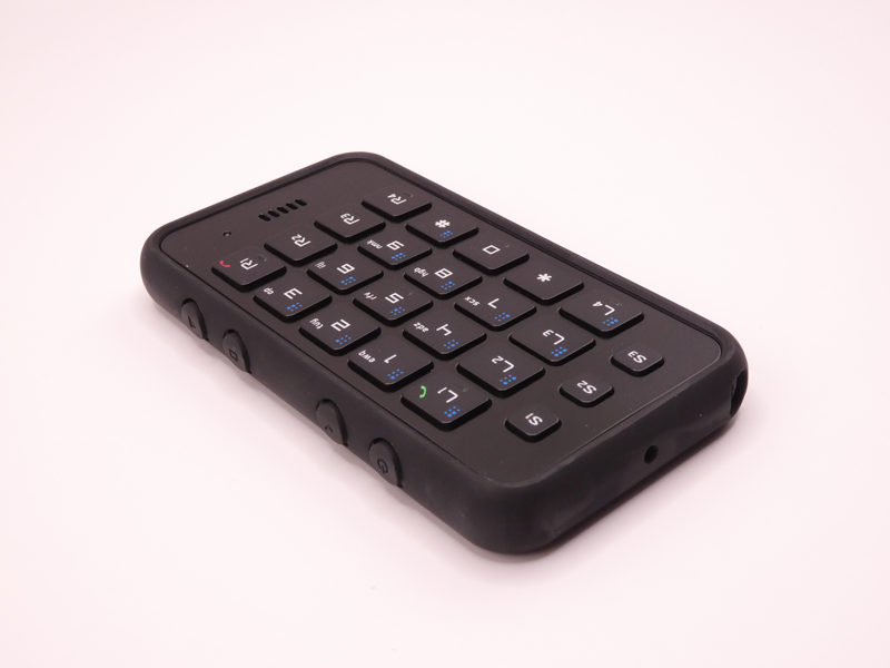 An ultra-compact, credit-card-sized Bluetooth smart interface designed for users with visual disabilities to control smartphones without relying on screen gestures. It features 12 physical, braille-compatible keys, a speaker, and a microphone, allowing for calls, texting, and app navigation directly from the device.